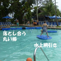 PICウォーターパークのメインプール。ここで、水中エアロビクスや水球のイベントもやっています。ビートバンを渡る遊びや、棒にしがみついて落とし合うゲームや水中綱引き、水上バスケットなど、自由に遊ぶことができます。 スライダーで使うウォーターフロートでぷかぷか浮かんで楽しむ人もいます。